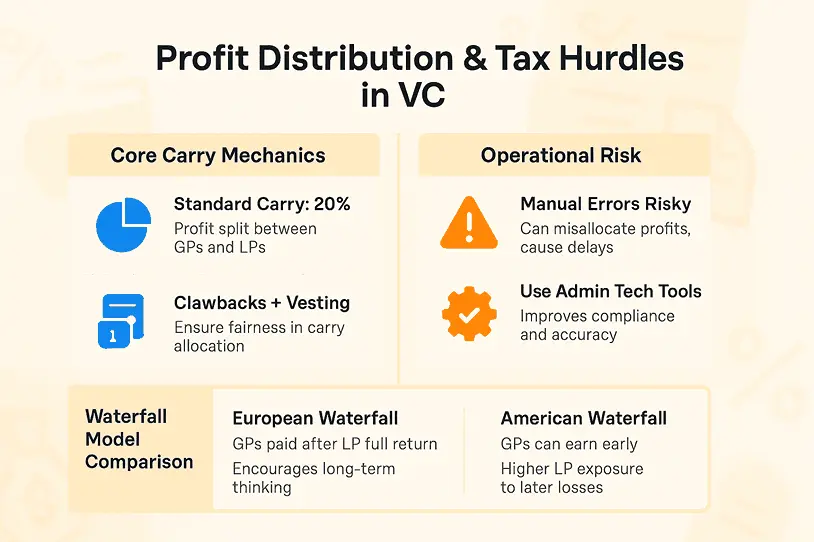 - Profit flows through two main waterfalls: the European model returns all contributed capital plus a preferred return to LPs before you earn carry, whereas the American version releases carry deal by deal once each investment breaks even.