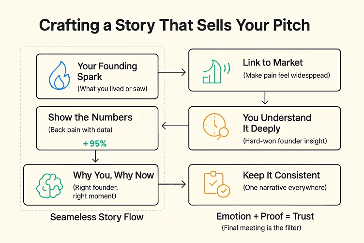 A standout pitch starts with a story that feels real and hits both emotionally and analytically. Investors don’t just want to know what you’re building; they want to know why you, why this, and why now.