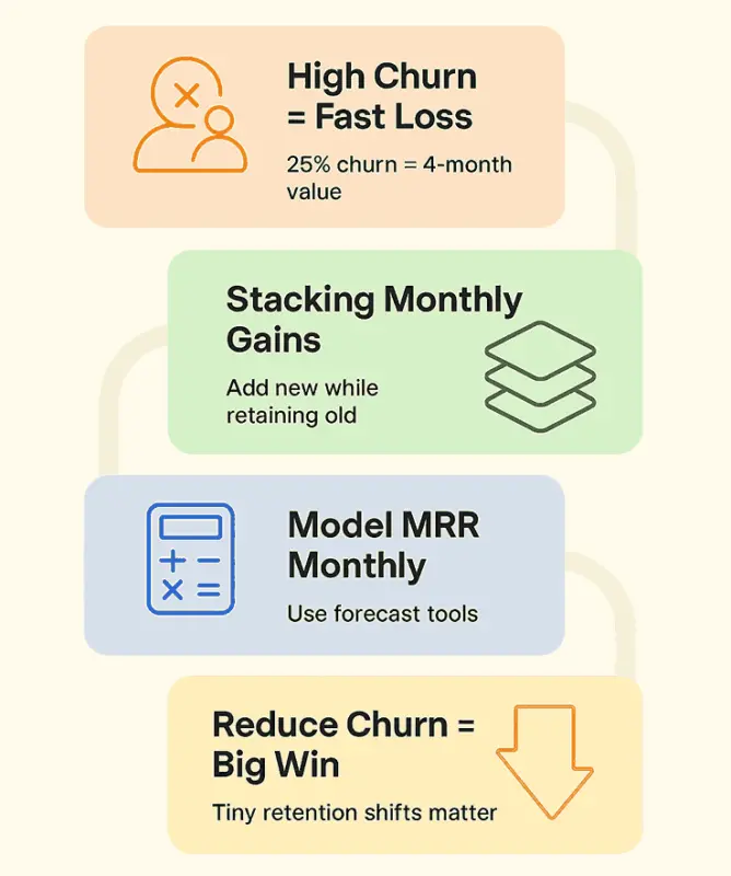 To counteract churn, startups must balance new monthly revenue with residual income from retained customers. This stacking effect ensures that while new revenue streams are added, the impact of churn is minimized.