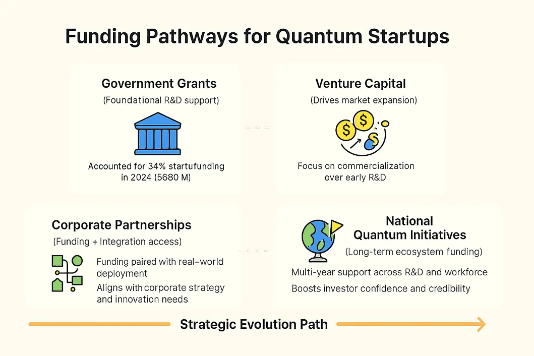 Common funding sources for quantum computing startups include government grants, venture capital, and corporate partnerships. These channels support both R&D and growth initiatives.