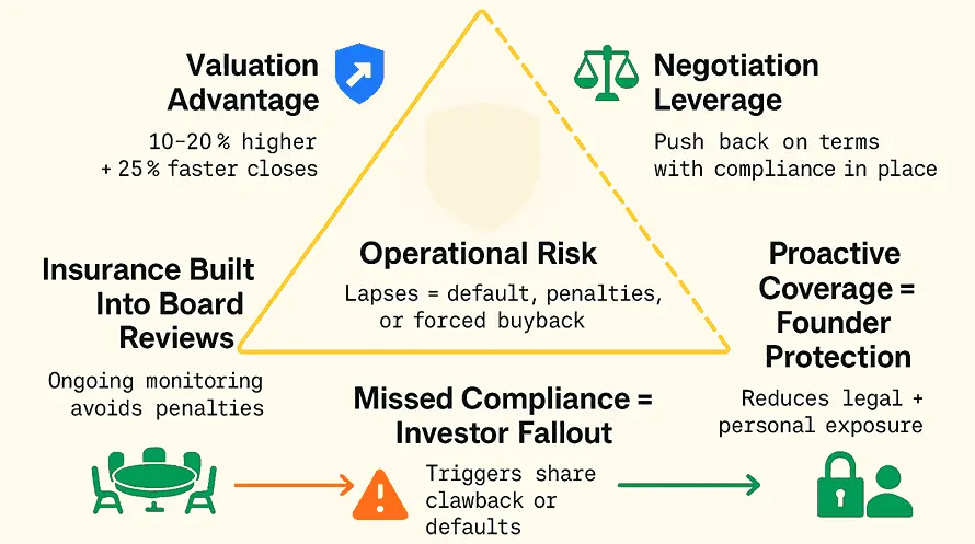 Startups with robust insurance coverage are seen as lower risk. According to recent data, companies that proactively meet insurance covenant requirements close rounds 25% faster and at 10-20% higher valuations than those that scramble to comply late in the process.