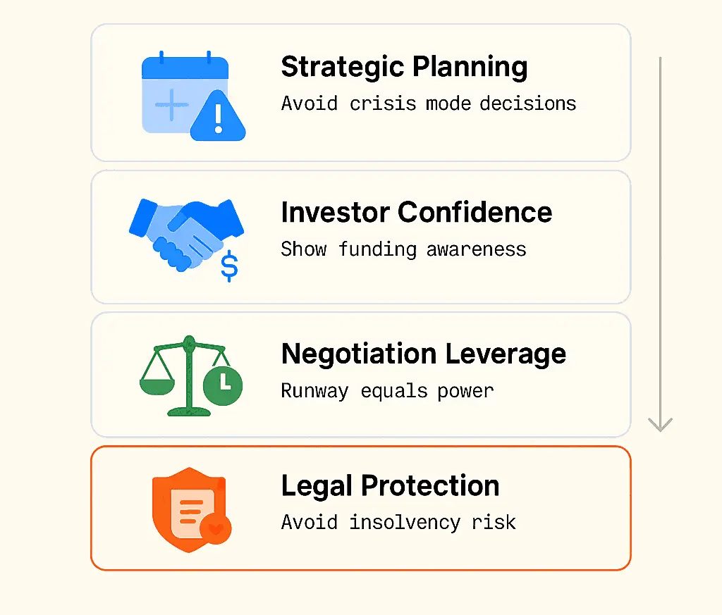 • Negotiating Power: When you're approaching your zero cash date, your negotiating position weakens dramatically. Founders with longer runways can be more selective about funding terms and strategic partnerships.